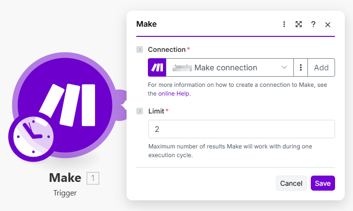 "help": "Maximum number of results Integromat will work with during one execution cycle.",