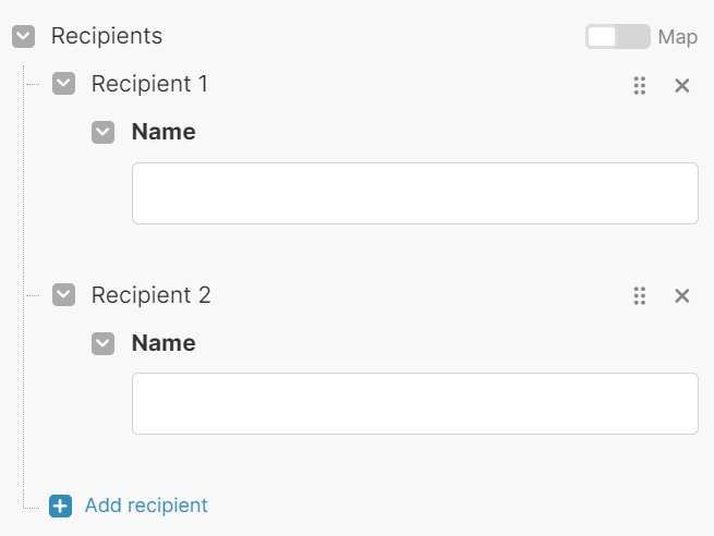 * The button label should be consistent and related to the label of array items. For example, if the label of an array item is `Recipient` , the label of the button should be `Add recipient`.