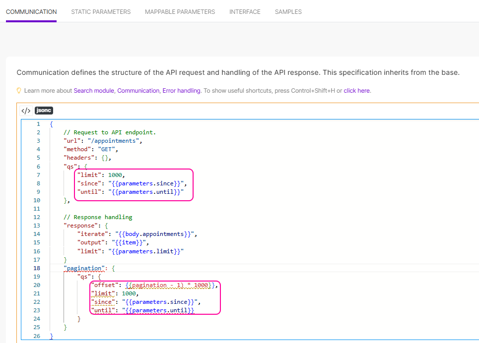 The pagination directive contains `"since"`, `"until"` and `"limit"` parameters that are already defined in query string ("qs").