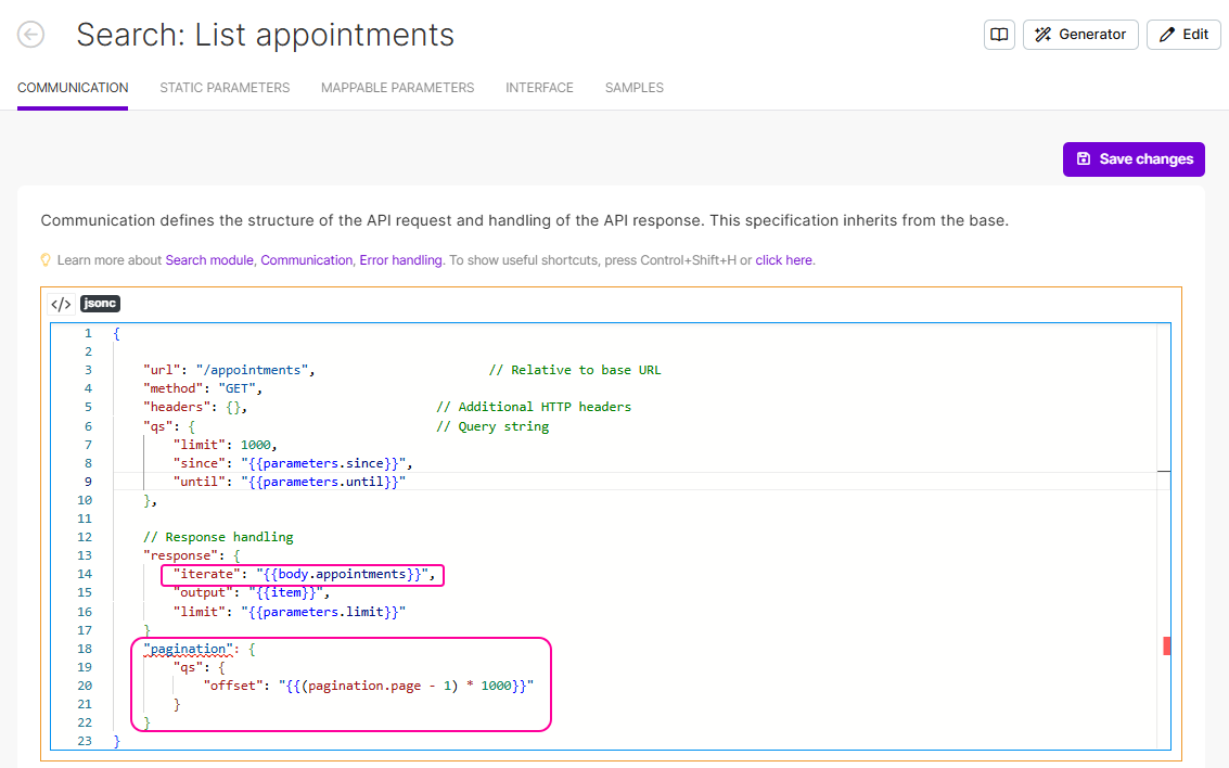 The pagination directive correctly contains only the `"offset"` parameter.