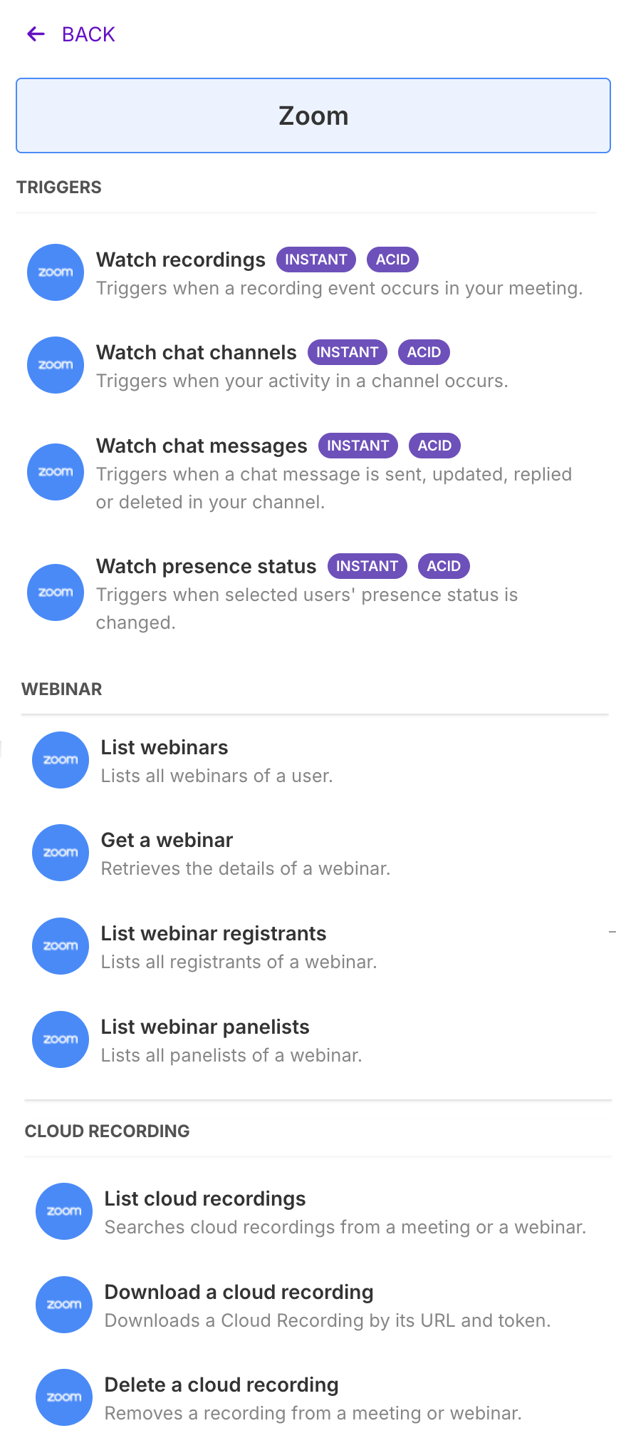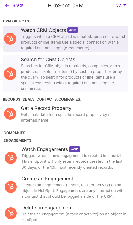 Sorted in groups (examples: TASKS, DEALS, CONTACTS)