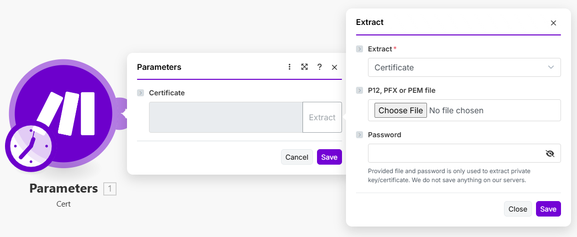 If your service requires providing a certificate in PEM format, you can use the `cert` parameter. It's possible to paste a PEM string into the file or you can extract it directly from a P12 or PFX file.