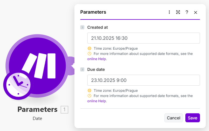 Mappable parameters, which require a date in any format, should allow users to enter a date in a user-friendly manner and their own time zone (e.g. `1. 12. 2021 16:30`) and also use our keyword `now`, `timestamp`, or any built-in date functions.