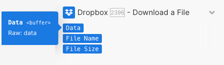 The Download a file module downloads a file from the service with data type `buffer` in the interface.