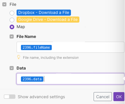 The parameters are correctly evaluated and automatically pre-mapped in the file input dialog in the following module that accepts `buffer` with the file's name and data.