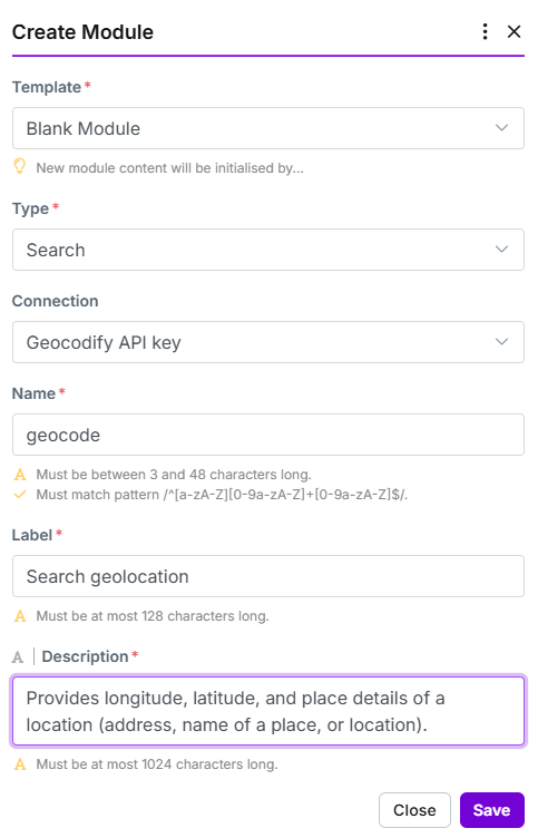 In the pop-up window, fill in the module details. The chart below contains the values to use for your Geocodify app.