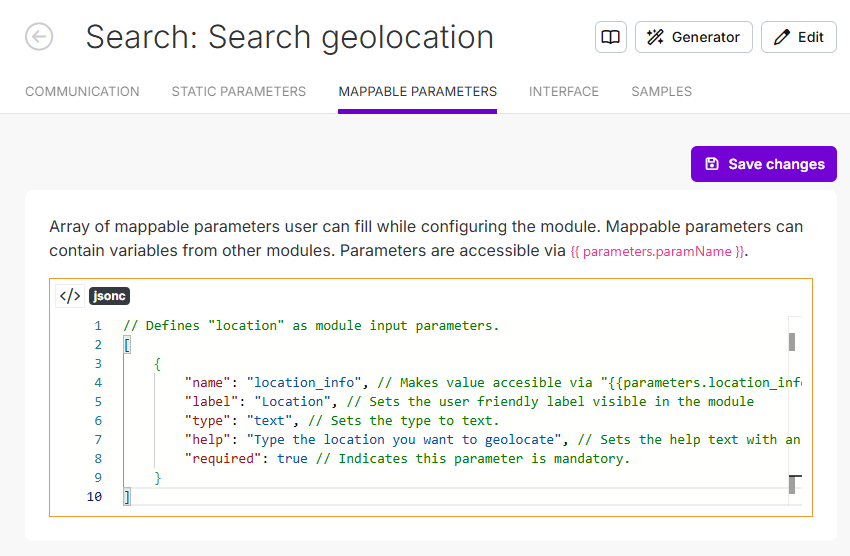 Query parameter containing the location to geolocate. Note that you access it by using parameters.location_info.