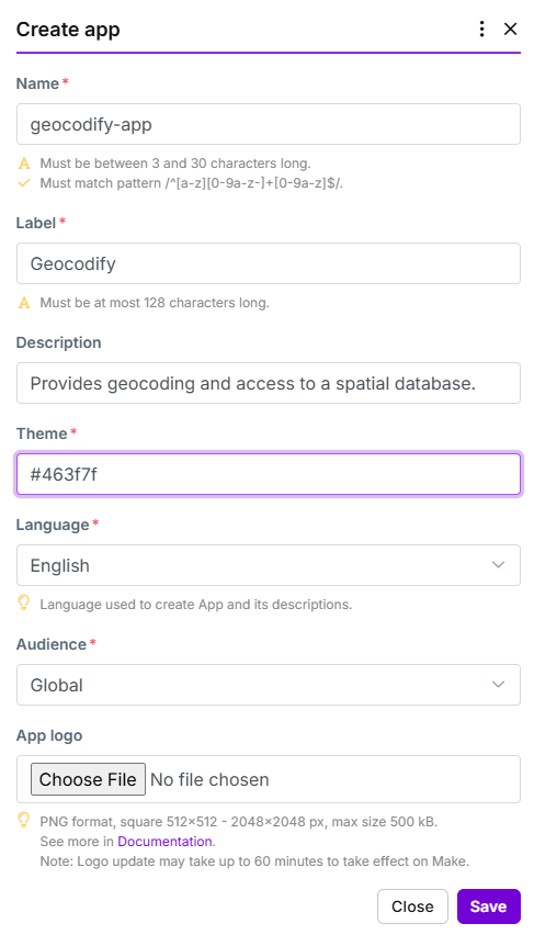 In the pop-up window, fill in the app details. The chart below contains the values to use for your Geocodify app.