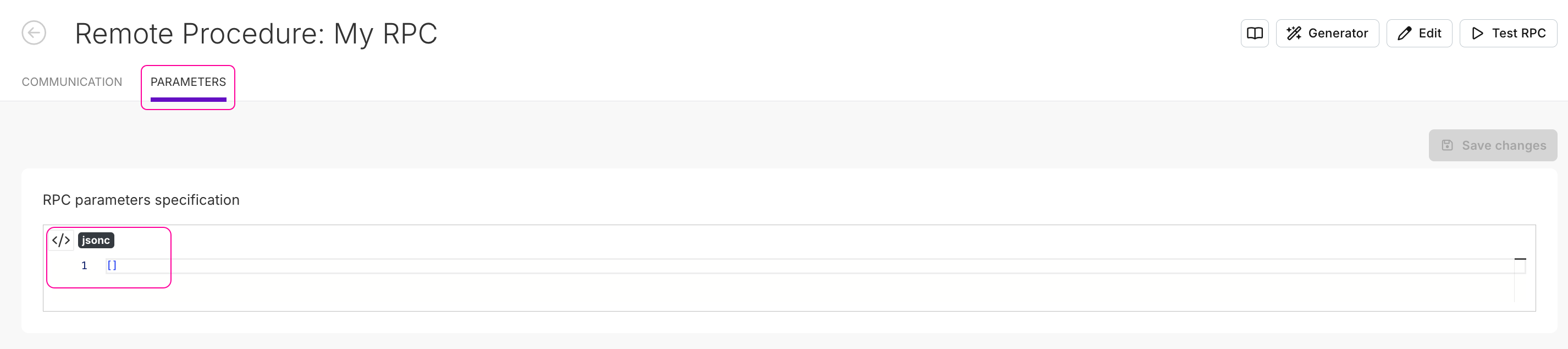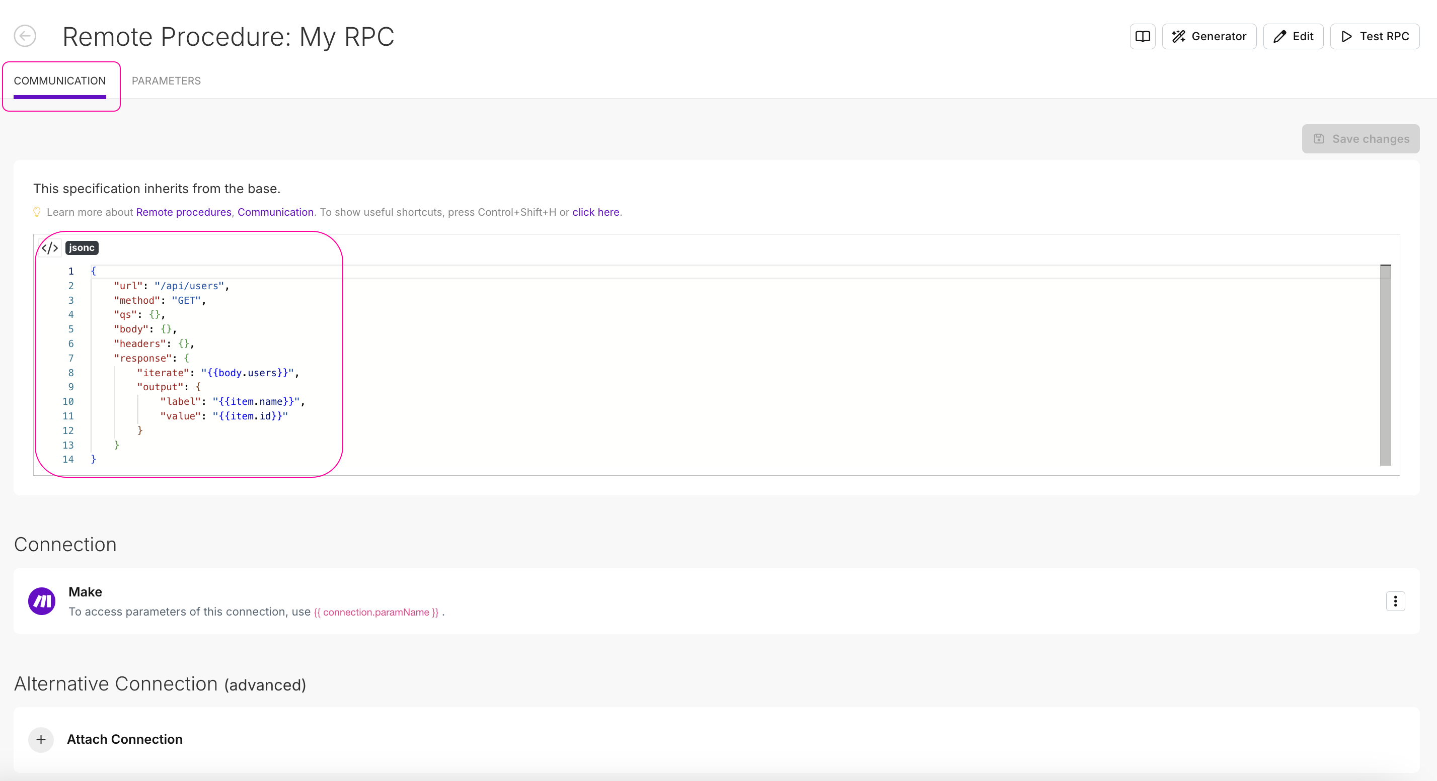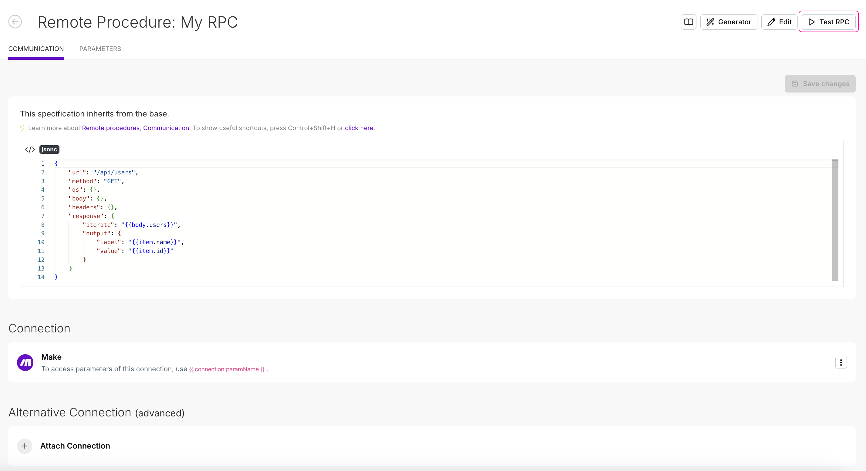 By default, the Parameters tab is empty. Here you can add any parameter you need. You can also add mappable parameters from a module. [Learn more about using RPC parameters](https://developers.make.com/custom-apps-documentation/app-components/rpcs/dynamic-options-rpc#select-parameter-with-rpc-options).