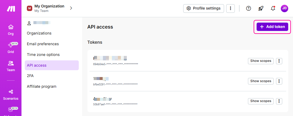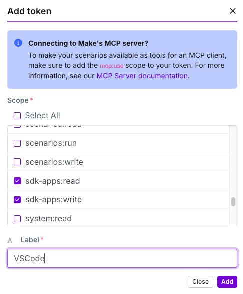 Add more API scopes to your API key as needed. You can find descriptions of the API scopes in the [Make API documentation](https://developers.make.com/api-documentation/authentication/api-scopes-overview).